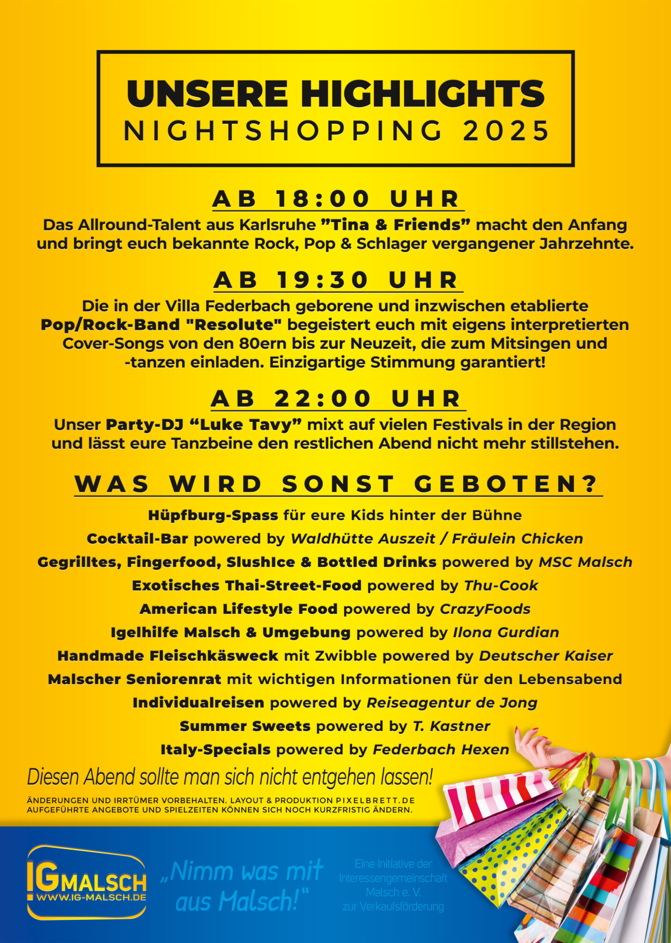 Am Freitag, den 05. September 2025, verwandelt sich die Malscher Ortsmitte erneut in eine lebendige Event- und Erlebnismeile. Das „Malscher NightShopping“ kehrt mit einem erweiterten Programm und zahlreichen Highlights zurück und lädt Besucherinnen und Besucher jeden Alters herzlich ein.
