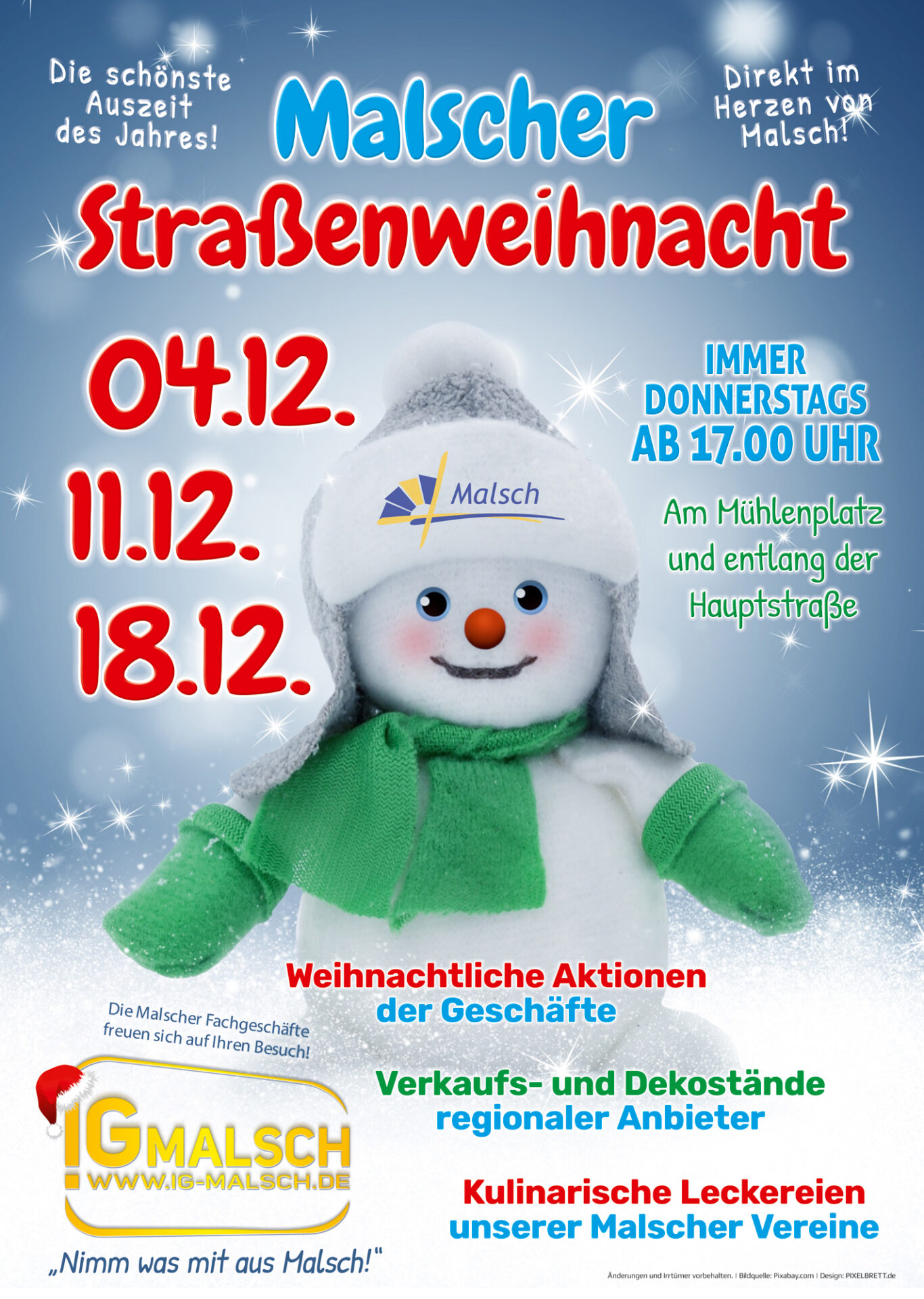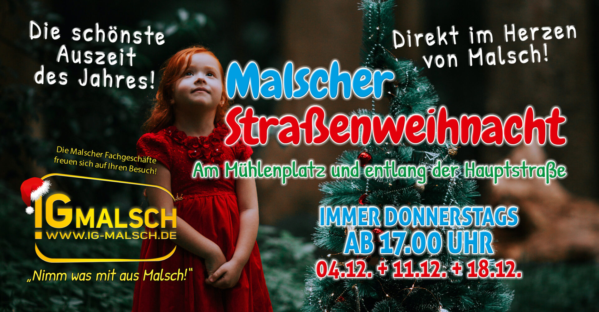Am 04.12. + 11.12. + 18.12.2024 findet die überregional bekannte Malscher Straßenweihnacht Mitten im Zentrum von Malsch vom Mühlenplatz entlang der Hauptstrasse bis zum NKD statt.
